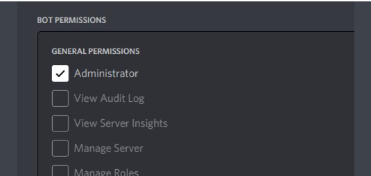 2. Go down to the Bot permissions, in my example I just give the Bot all the permissions so I select admin, but you’ll potentially want to be a little more considerate in how much power you give your bot.
